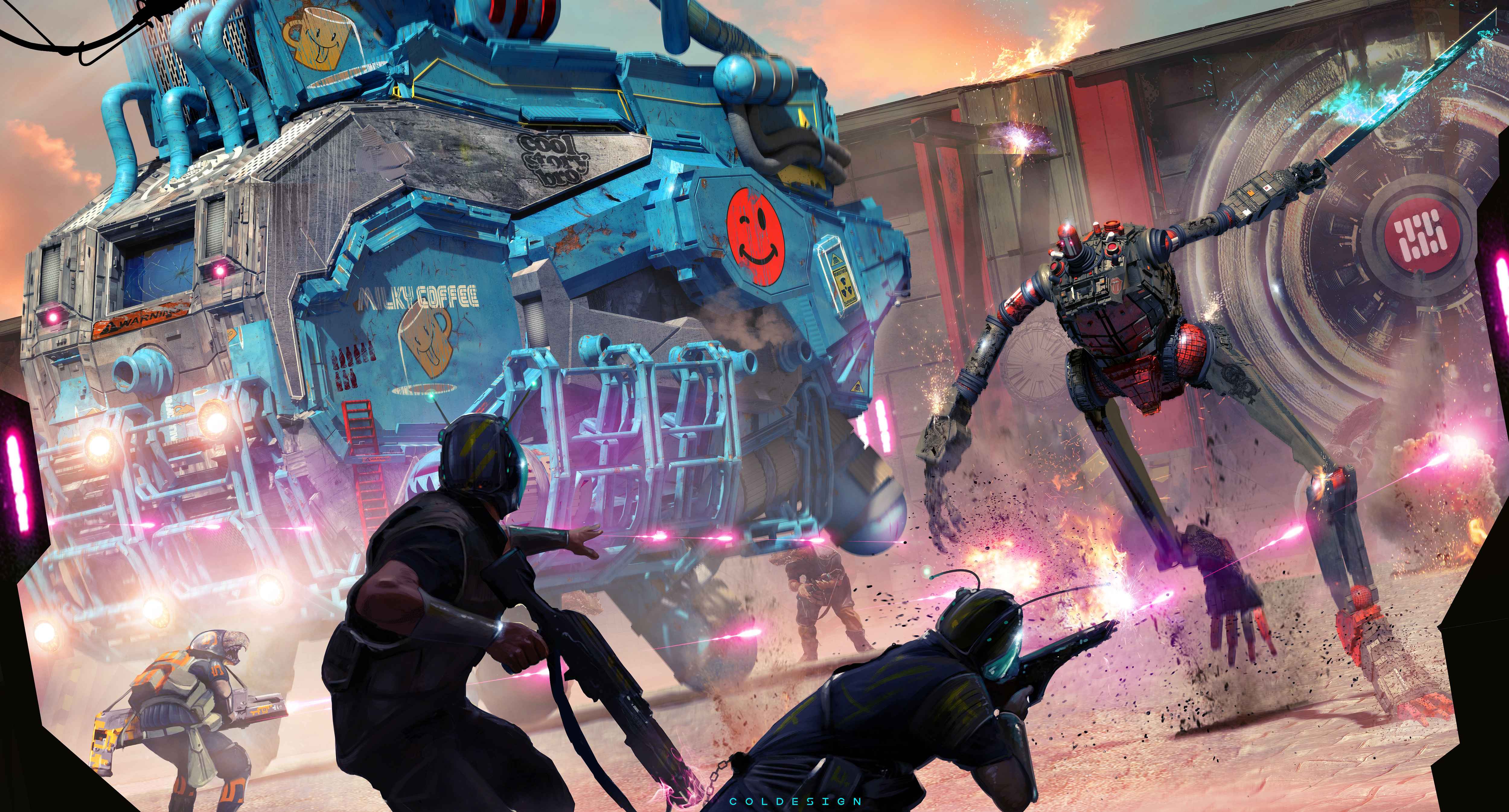 So things didn’t go too much to plan in this shot, as Bob goes full berserk mode at the space port. again lots of fun with this. the set is 3d as is bob, who’s now fully pose able for different shots. all the elements are rendered out as separate files and then comped in in photoshop.the rest of the characters and vx etc is all 2d.